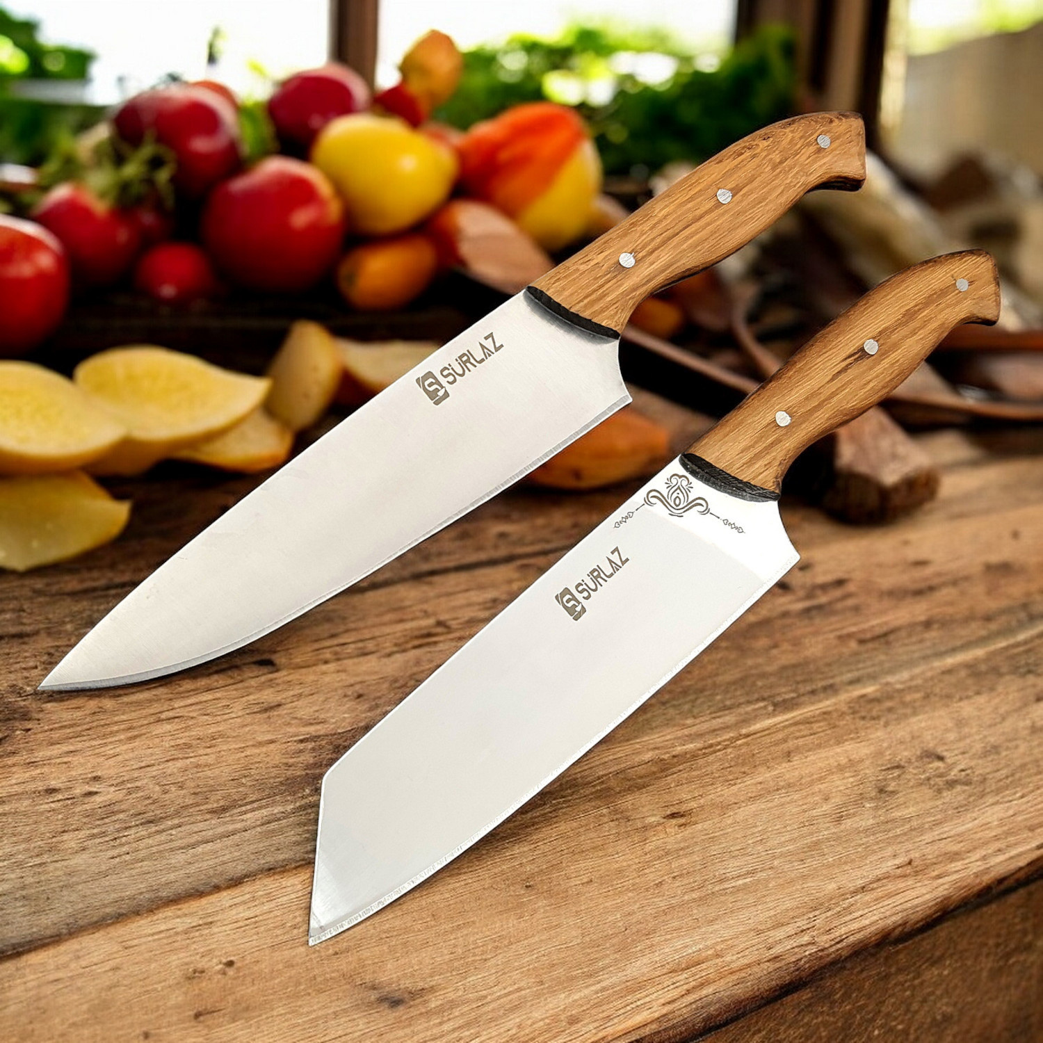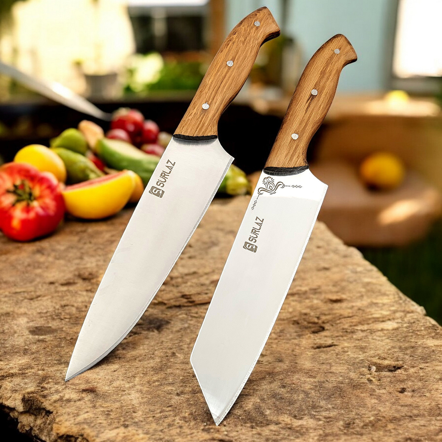 2’li Şef Bıçağı Hediye Seti – El Yapımı Ahşap Saplı Paslanmaz Çelik Profesyonel Mutfak Bıçakları