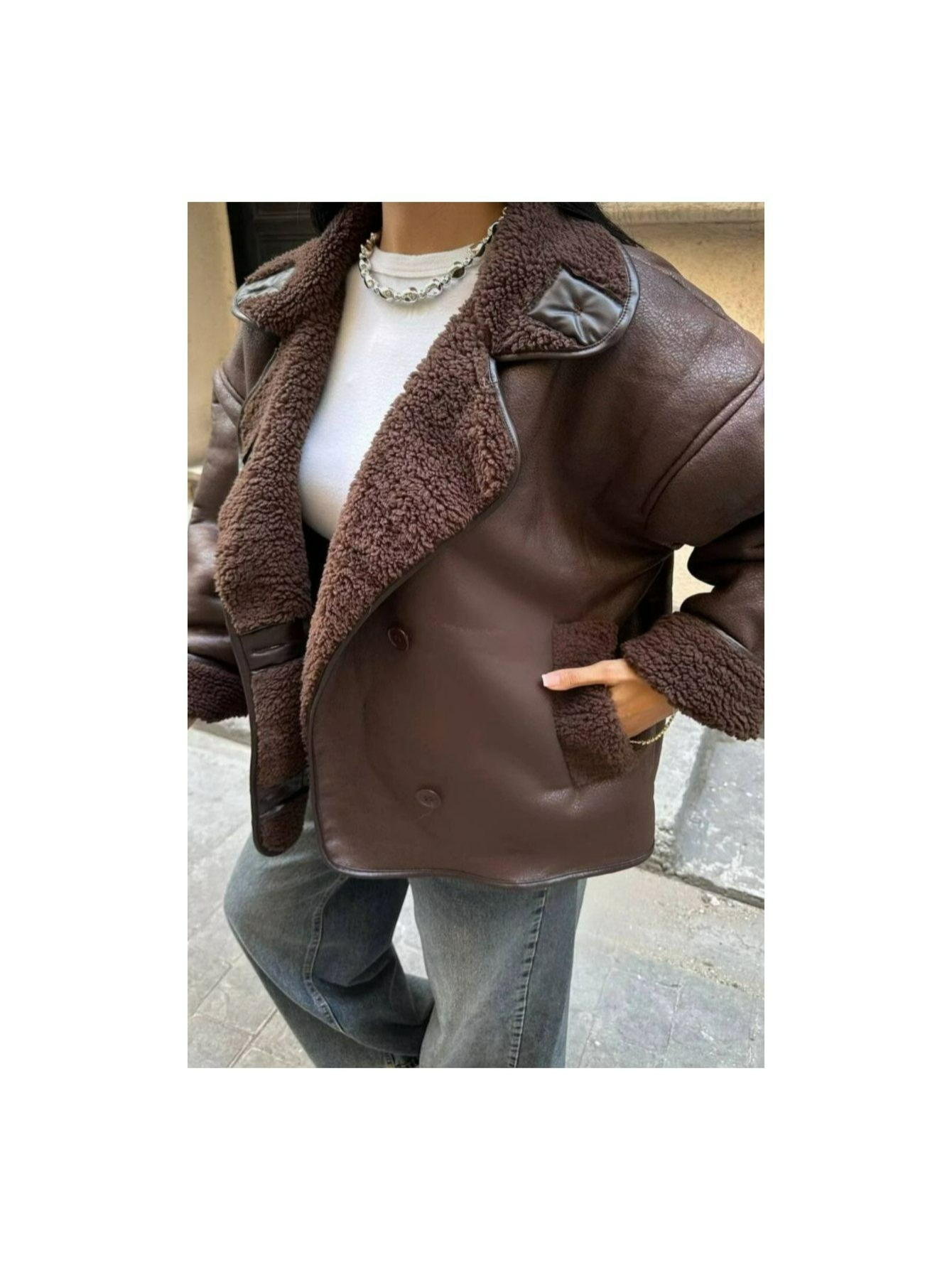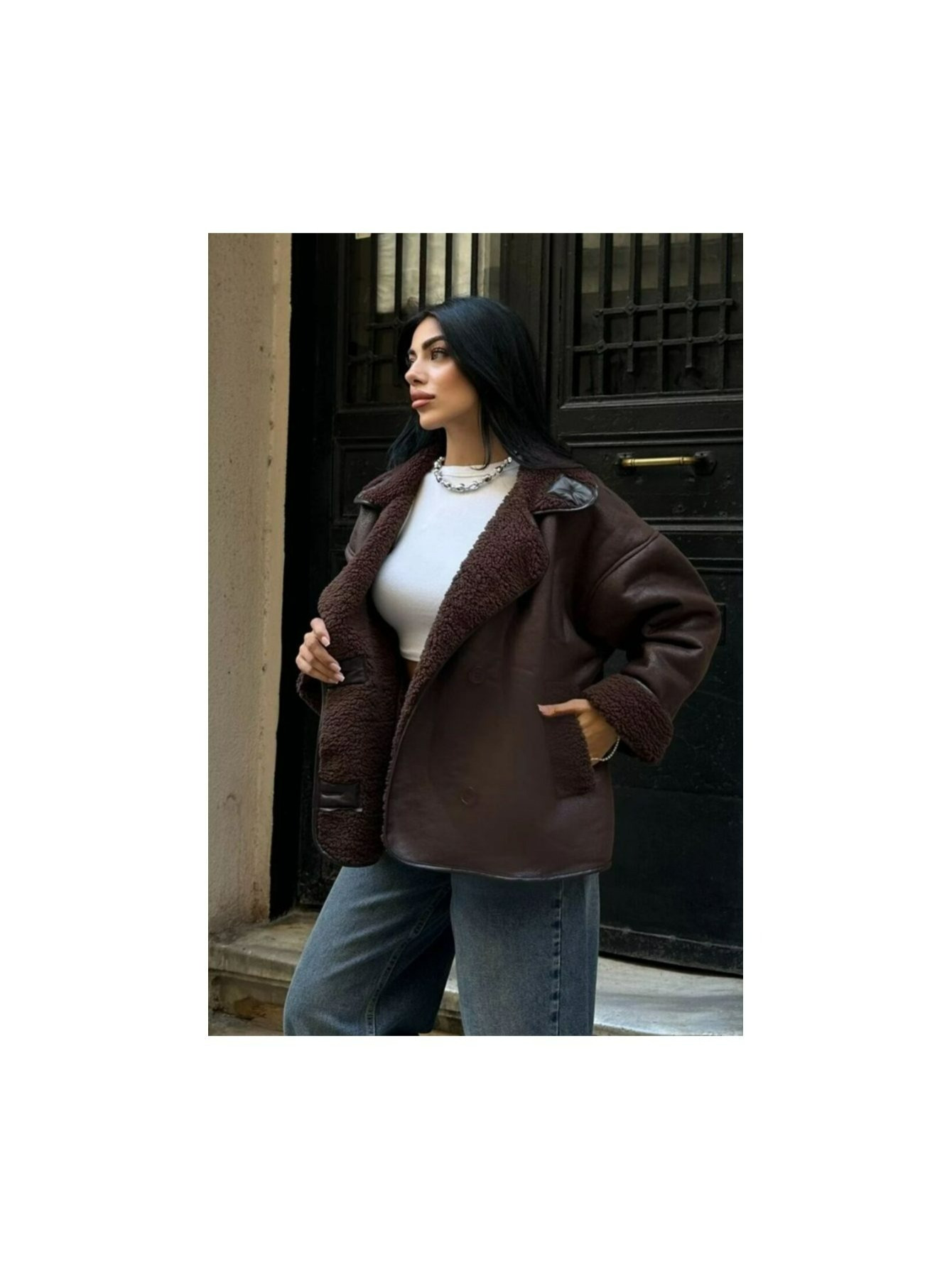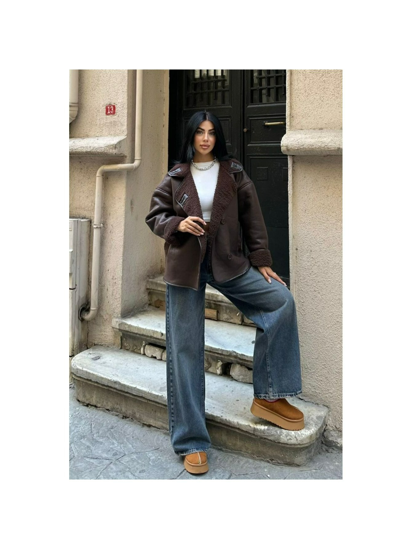 Soğuk havalara karşı hem sıcak hem iddialı bir duruş. Kahverengi oversize shearling kadın deri mont, kış stilinin en güçlü trendlerinden biri.